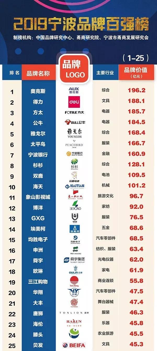 “宁波品牌百强榜”作为宁波市首个按照国际标准制定的权威品牌榜单,有宁波品牌“奥斯卡”的美称。此榜单由甬商发展研究会牵头组织,并联合中国品牌研究中心等国内权威机构作为榜单的指导和共同主办单位,自2012年至今已连续发布七届。
