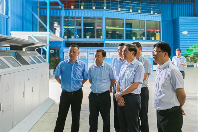 宋越舜副书记一行在总经理王鲸航的介绍下,了解了"搭把手”自主研发的新一代智能分类回收柜、厨余和其他垃圾新一代AI智能前端管理设备。