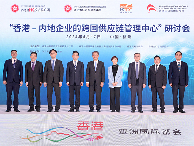 本次研讨会由香港特区政府投资推广署、香港特区政府驻上海经济贸易办事处、香港贸易发展局、香港出口信用保险局和浙江省工商联共同举办。香港特区政府财政司司长陈茂波出席研讨会并作主旨演讲,他在演讲中介绍了香港的经济和社会近况,以及香港如何发挥离岸贸易和跨国供应链管理中心优势助力内地企业拓展国际业务。