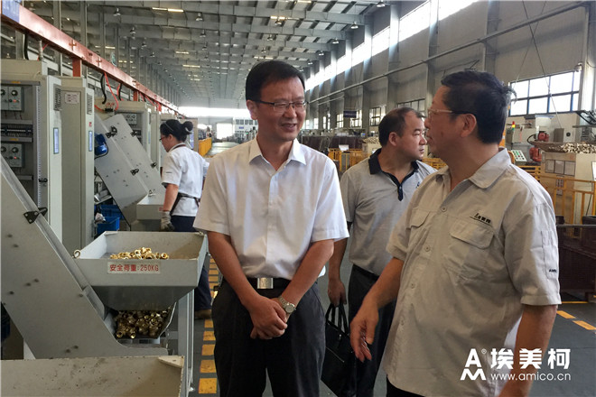 - 日前,上午镇海区委常委组织部长戴凌云一行到埃美柯公司考察,戴部长深入车间班组了解生产情况,对埃美柯近几年来的转型升级和企业发展作了充分的肯定。图为埃美柯公司总经理沈国强介绍