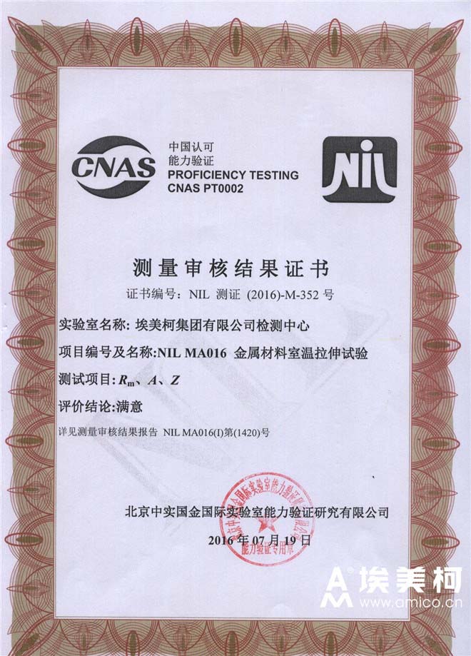- 最近,埃美柯集团公司检测中心根据CNAS“能力验证领域和频次要求”及内部质量监控计划的安排,“拉伸试验(抗拉强度、断后伸长率、断面收缩率)、洛氏硬度、橡胶硬度”三个项目经中国认可能力验证,均获“能力验证”满
