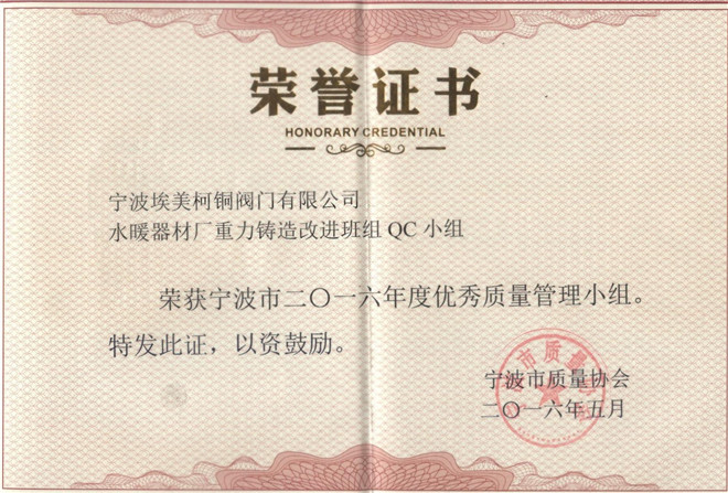 - 在宁波市2016年度优秀质量管理小组经验交流会上,铜阀门厂朱晖发表交流了现场型QC课题《实现108-DN20闸阀手轮装配半自动化》。埃美柯公司两个QC小组分别荣获“宁波市