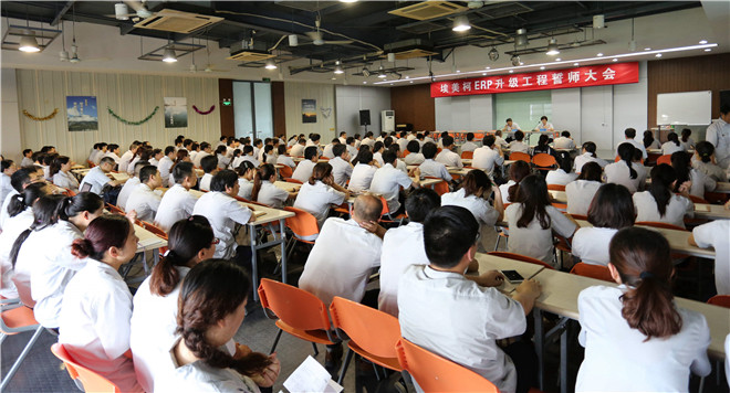 - 6月8日,埃美柯公司隆重举行ERP系统项目实施誓师大会,沈国强总经理发表了简短而重要的主旨演讲。这次会议的召开表示涵盖埃美柯最大业务范围的ERP系统实施已进入最后攻坚和决战阶段。图为誓师大会场