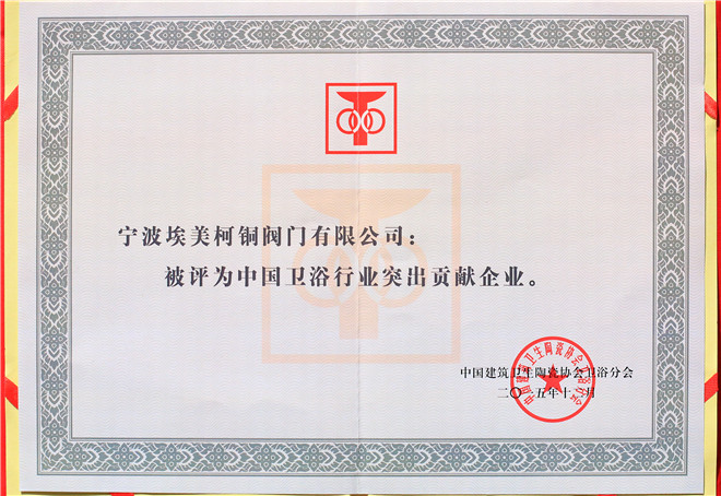 - 宁波埃美柯铜阀门有限公司被中国建筑卫生陶瓷协会卫浴分会评为“中国卫浴行业突出贡献企业”。 (埃美柯集团)