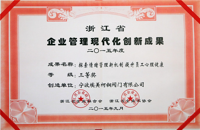 - 埃美柯公司“探索情绪管理新机制 提升员工心理健康”,在获得“2015年宁波市企业管理现代化创新成果一等奖”后,再获“2015年浙江省企业管理现代化创新成果三等奖”。 这也是埃美柯公司继2