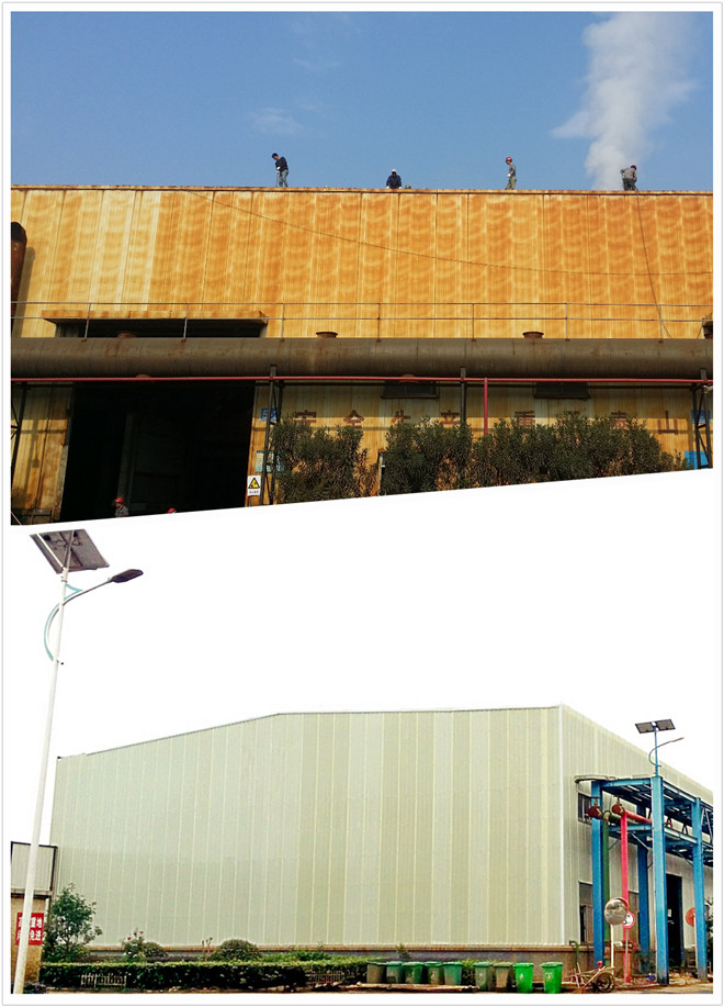 - 浙江环益资源有限公司厂区厂房已运行使用多年,厂房外墙原先使用的是铁质材料,锈蚀脱落现象严重,已成为厂区重大的安全隐患。近日,公司外墙进行了彻底的翻新改造,厂区面貌焕然一新。图为制球车间外墙翻新前后对比。