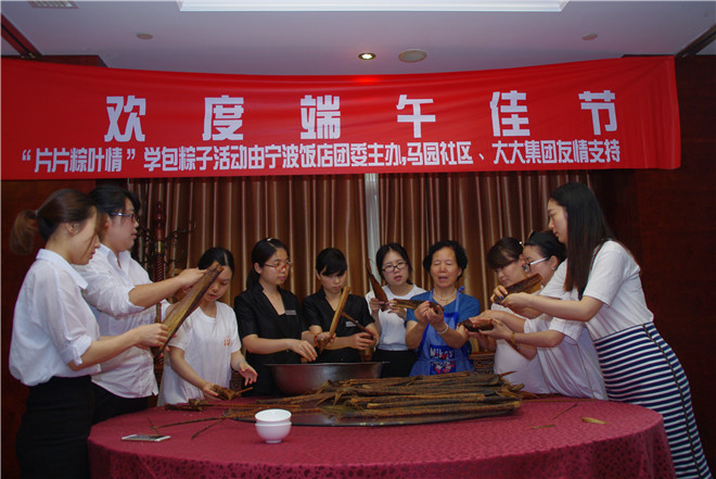 - “传承中华文化,欢度端午佳节”“片片粽叶情”学包粽子活动由宁波饭店团委主办,马园社区、大大集团友情支持。看大家学习包粽子多么认真啊!