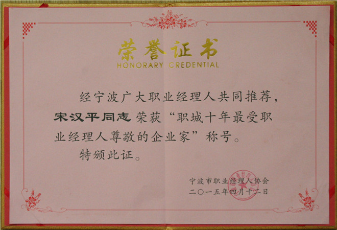 - 宋汉平董事长被授予职城十年最受职业经理人尊敬的企业家