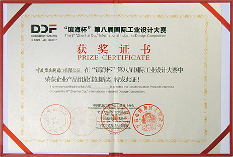 - 第八届“镇海杯”企业最佳创新奖奖杯 由中国机械工程学会工业设计分会、镇海区政府、市科协联合举办的“镇海杯”第八届国际工业设计大赛,宁波埃美柯铜