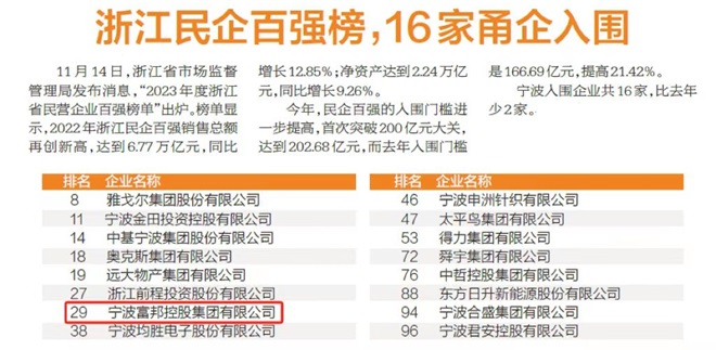 - 11月14日,浙江省市场监督管理局发布消息,“2023年度浙江省民营企业百强榜单”出炉。宁波豪利777控股集团有限公司蝉联浙江省民营企业百强。 (集团办公室)