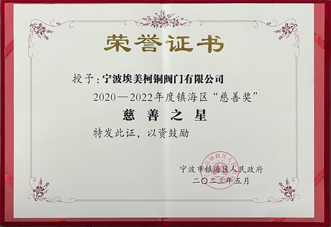 - 6月6日上午,在镇海区政府会议中心举行2020-2022年度镇海区“慈善奖”表彰大会暨2023年“慈善一日捐”动员大会,宁波埃美柯铜阀门公司被授予2020-2022年度镇海区“慈善之星”。&n