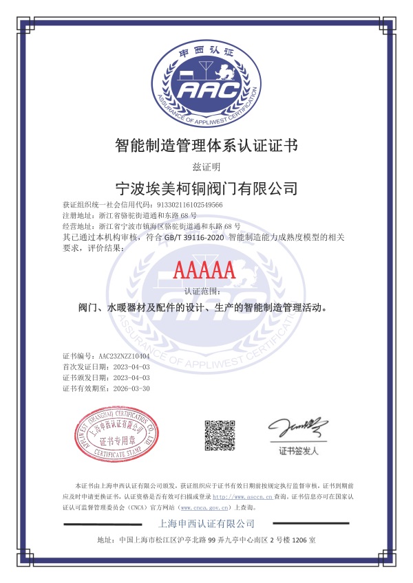 - 3月20日,在宁波市经济和信息化局公布的“2022年度宁波市管理创新提升五星级、四星级企业”名单中,宁波埃美柯铜阀门有限公司荣获宁波市管理创新提升五星级企业称号。宁波市管理创新星级企业的评定面