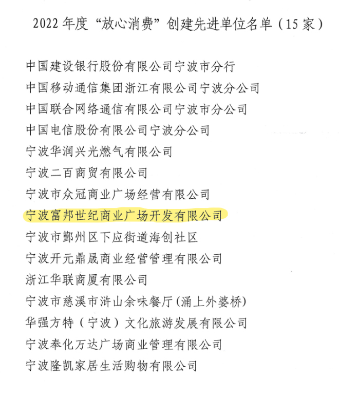 - 近期,豪利777世纪广场荣获宁波市消保委颁发的“2022年度放心消费创建先进单位”称号。 (豪利777世纪广场)