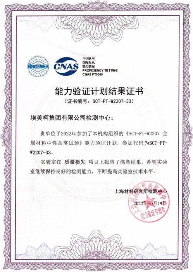 - 近期埃美柯集团有限公司检测中心参加了上海材料研究组织的能力验证计划,检测中心出具的“抗拉强度(Rm)、断后伸长率(A)、断面收缩率(Z)、中性盐雾试验质量损失”4个参数均获得“满