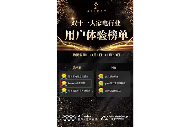 - Twinwash荣获阿里巴巴双十一大家电用户体验榜排名洗衣机行业第二名