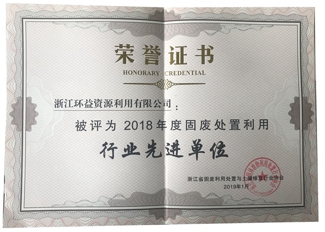 - 浙江环益资源利用有限公司被评为2018年度固废处置利用行业先进单位