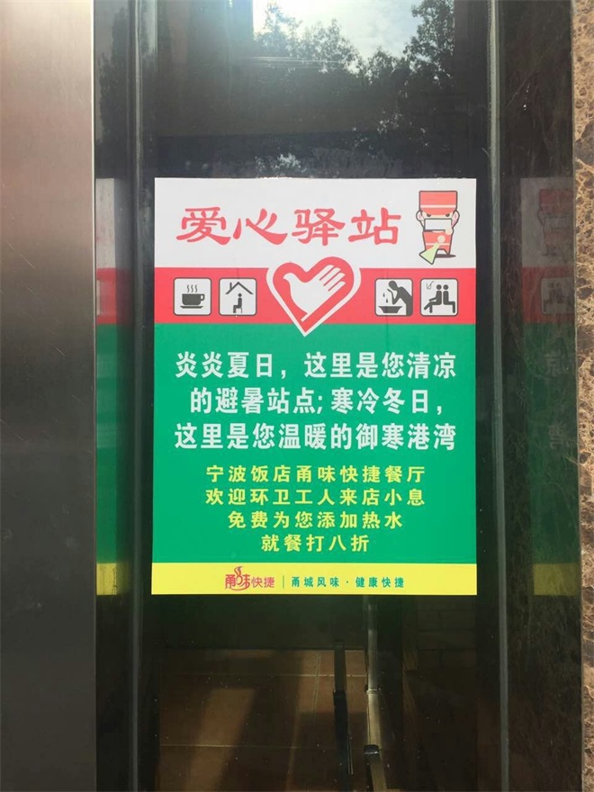 - 近日,宁波饭店为完善环卫工人的爱心驿站建设,在甬味快捷餐厅推出爱心驿站新举措:欢迎环卫工人到餐厅休息小憩,免费提供茶水,环卫工人就餐可享受打八折优惠。 (宁波饭店)