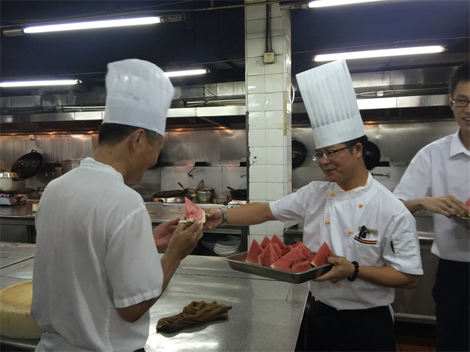 - 炎炎夏日,奋战在火炉边的大厨、烈日下的安保队员、维修中的工程师傅都备受煎熬。为此,云海宾馆工会组织人员在日气温达到或超过36度时,为坚守在高温岗位的员工们送上西瓜、绿豆汤、棒冰等消暑饮品。图为