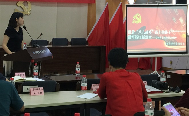- 7月14日上午,云海宾馆全体党员积极参加由月湖街道组织的党课活动,认真学习省十四次党代会精神。图为市委党校郭晓禄老师正给党员们讲解浙江“八八战略”。 (云海宾馆)