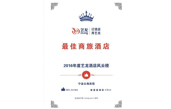 - 云海宾馆被艺龙网评为2016年度最佳商旅酒店