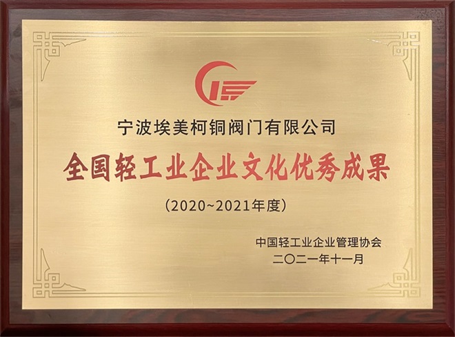 近日,宁波埃美柯铜阀门有限公司荣获中国轻工业企业管理协会颁发的全国轻工业企业文化优秀成果一等奖和2020—2021年度全国轻工业企业文化优秀成果奖。