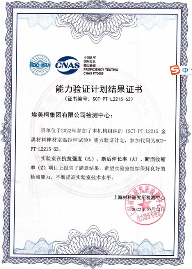 近期埃美柯集团有限公司检测中心参加了上海材料研究组织的能力验证计划,检测中心出具的“抗拉强度(Rm)、断后伸长率(A)、断面收缩率(Z)、中性盐雾试验质量损失”4个参数均获得“满意”结果。