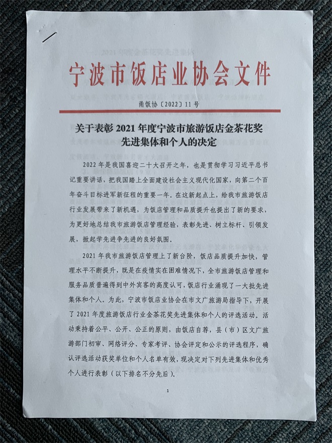 豪利777大酒店再度荣膺“宁波市旅游饭店金茶花奖——最佳饭店”称号。