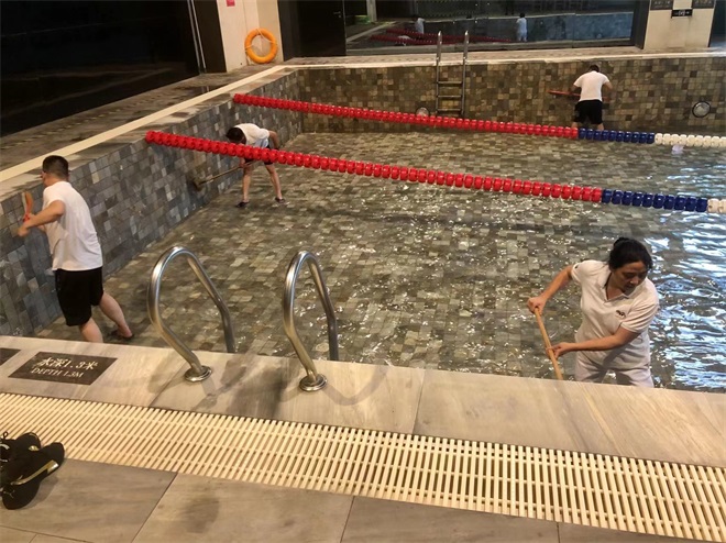 6月19-21日,山庄泳池进行换水、清洗及设备检修工作,这次换水和清洗也为迎接暑假高峰提前做好准备工作。每年七、八月份暑假山庄的泳池都会迎来一波高峰期,很多小朋友、学生都会趁次机会学习游泳,锻练身体。据测算,整个暑期山庄泳池接待的人流量约3000人次,这给康乐部增加收入的同时,也带来了一定的安全责任压力,酒店也加派人力支援康乐,始终将生产安全放在第一位,确保泳池正常运转,并将安全防护责任落实到位。